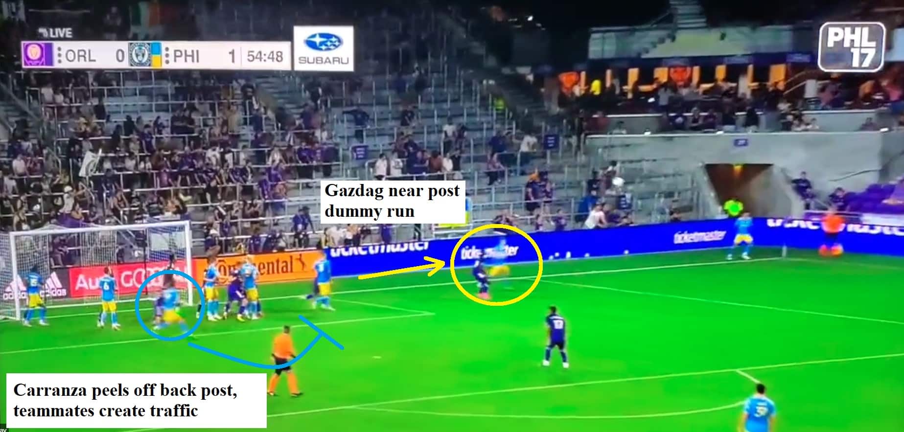 In this case specifically, the Union are using the near post guy in a dummy fashion while Julian Carranza peels off the back post and comes out to the 8-10 yard area, hoping to lose his defender:
