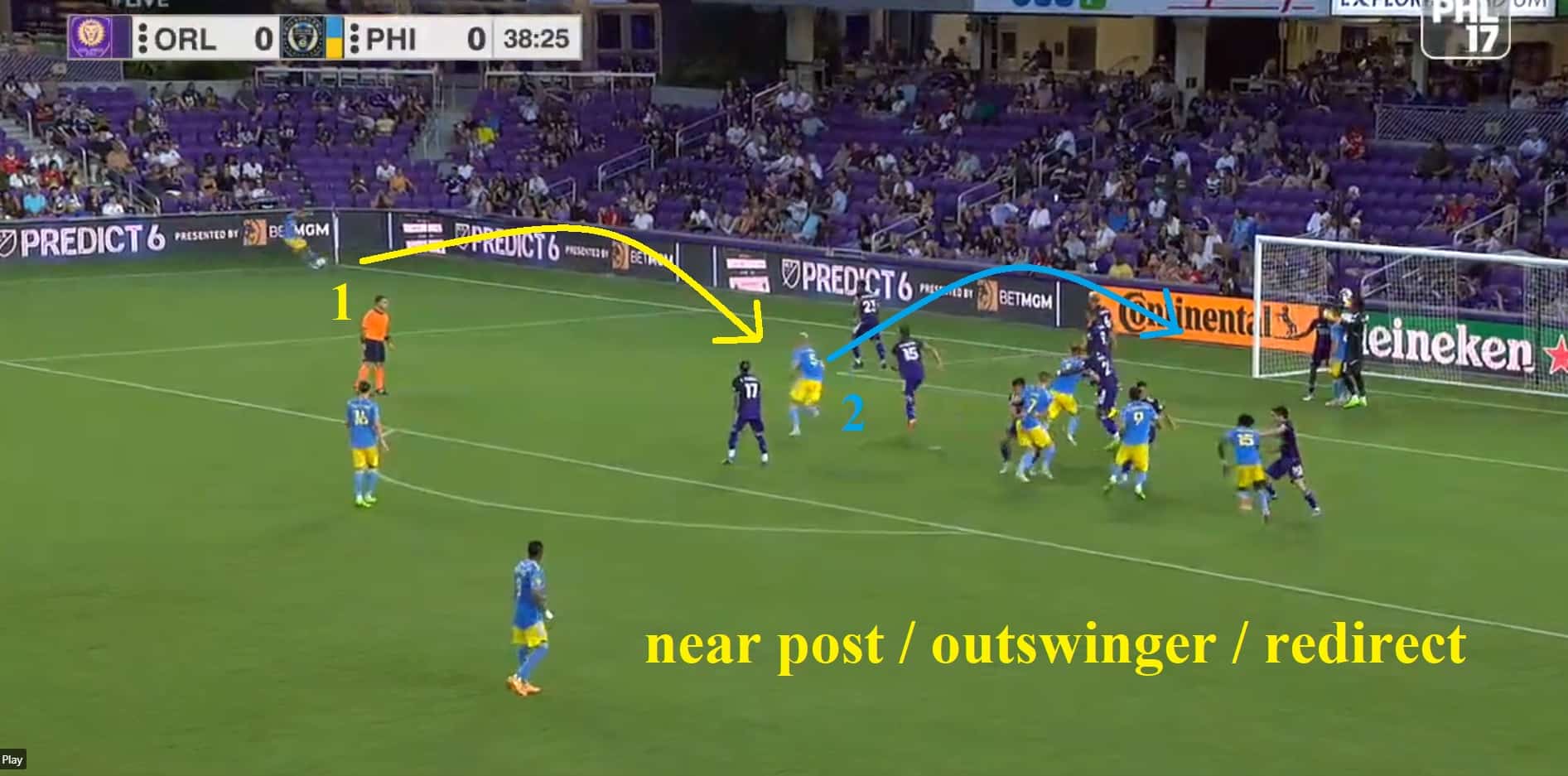 This is a near post seam. Most teams will just drive a ball to the far post from this distance, but the Union are trying to misdirect and have Glesnes head this ball back, against the grain. If the service is a little better, defenders will have to turn and react to the header and get their bodies reoriented, which can be difficult in a bang-bang type of situation:
