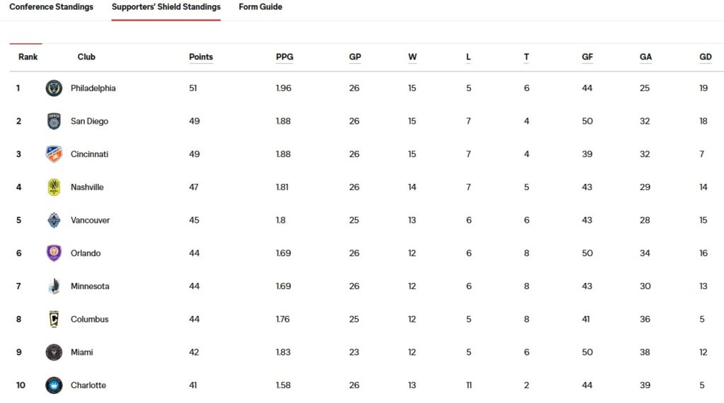 - The Shield winner typically finishes between 2.00 and 2.10 points per game. The Union are on 1.96 right now and won it with 2.04 PPG in 2020. They lost the LAFC tiebreaker with a 1.97 and 67 points in 2022.