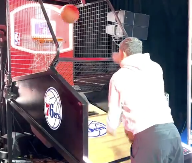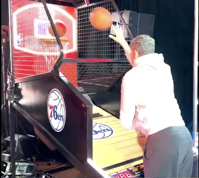 Michael Barkann started it off with a solid 49. I’ll be honest with you I didn’t think he had that in him. 49 is impressive. All this time I watched him screaming at pro athletes on the postgame show I was thinking he couldn’t carry their jock. I was wrong. He’s got some stroke. Must be the Syracuse connection. Next up was Pat Gallen. That dude is easily one of the most athletic people in Philly sports media. His stroke is too pure for a pop-a-shot competition. He’s not about to risk his mid-range game and ruin Tuesday night pick-up for an amateur competition and I respect that. Everyone knows pop-a-shot is a quantity over quality game. Where you have people like Gallen stroking it on the other end you have Jason Martinez and I just chucking.
