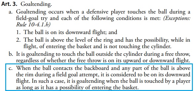 Normally you’re flagged for goaltending when you touch a ball after it hits the backboard, because it’s considered to be part of a shot’s “downward” flight. But there’s a second parameter here that’s explained in the 2017/2018 rule book: