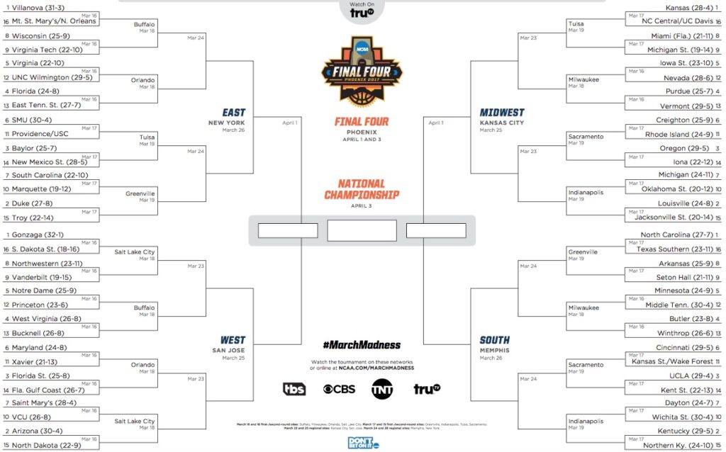 Hey, top overall seed? Here’s Duke, the ACC Champion, as your number two. As bad as it looks, I don’t hate it. Duke lost seven – SEVEN – games (only two less than Wisconsin!) and looked to be a rung below the top tier all season long, say nothing about their overgrown baby, Grayson Allen. I don’t think they make the Elite 8, but if they do, Villanova-Duke at Madison Square Garden will be lit. I still think Nova brain-fucks them.