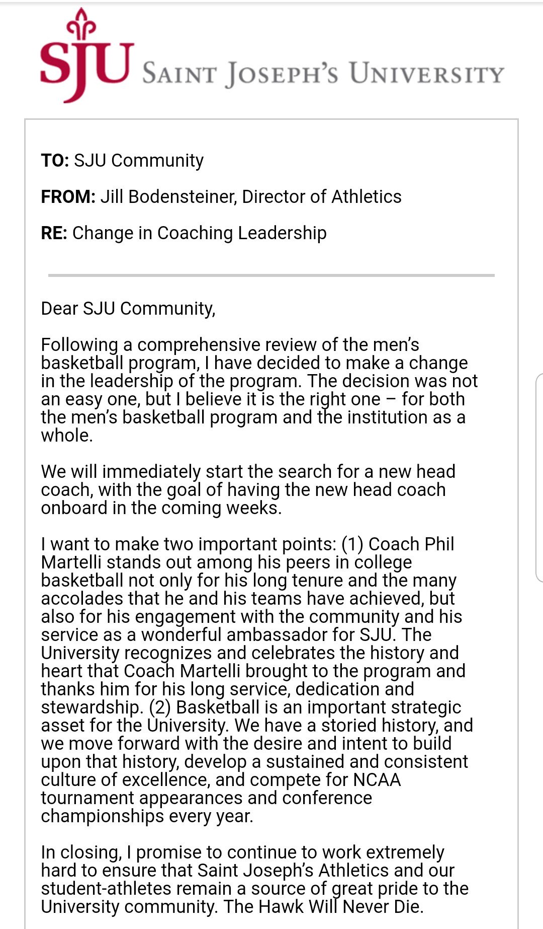 Saint Joe’s is moving on from Phil Martelli after 24 seasons, the rumors confirmed by a Tuesday morning press release from Athletic Director Jill Bodensteiner: