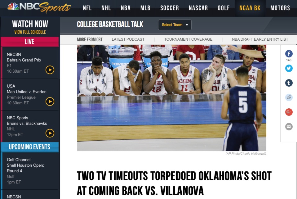 And that rule absolutely impacted the outcome of a game in the Final Four. I’m not saying that Oklahoma would have won had they not had to deal with those two TV timeouts, but I find it hard to believe they would have wilted the way that they did.