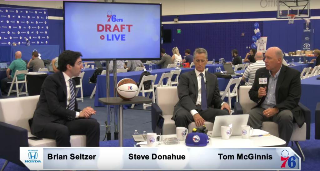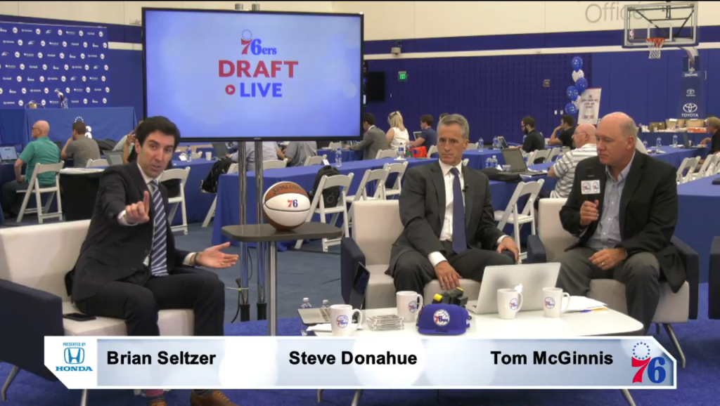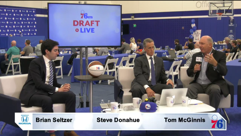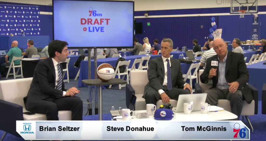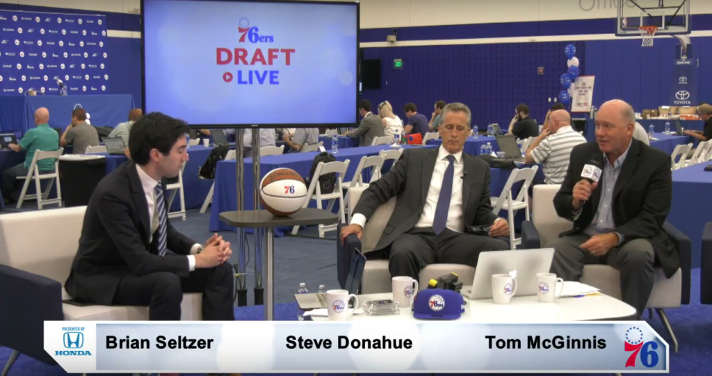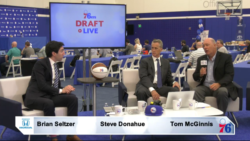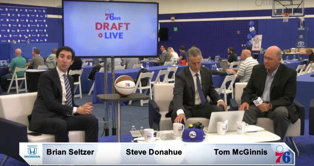 Well this is certainly something (H/T reader Drew Kingma). The Sixers’ official live stream – featuring Sixers reporter and pre/postgame show host Brian Seltzer, Penn head coach Steve Donahue, and radio play-by-play man Tom McGinnis – were in the midst of gushing about the team’s #10 overall pick Mikal Bridges when the unthinkable happened: he got traded.