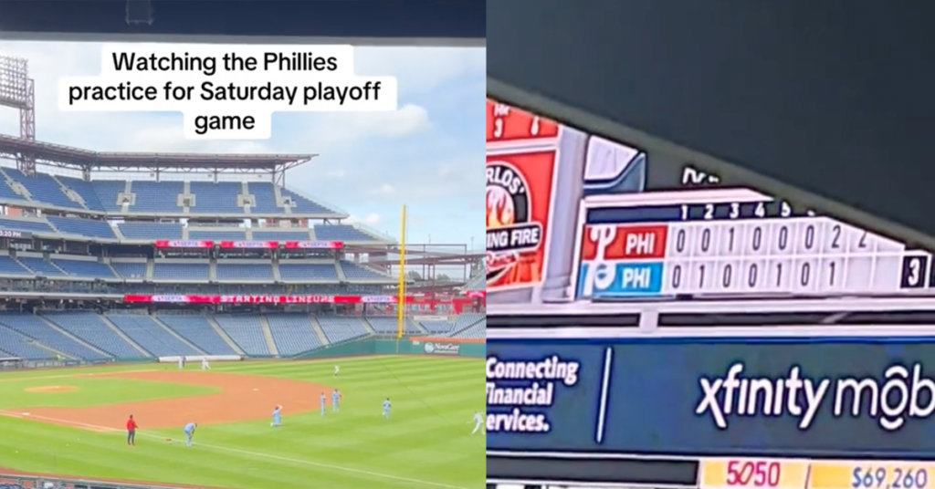 All we know right now is that the game finished 5-5 after eight innings. What happens with the wager? Who knows. Castellanos and Bryce Harper hit back-to-back home runs to tie it. Every reliever pitched but Jeff Hoffmann, who has a sore neck but should be good to go. Ranger Suarez looked good and Spencer Turnbull still has some work to do. Here’s some video from inside the ballpark from a couple contractors and vendors that I found on TikTok: