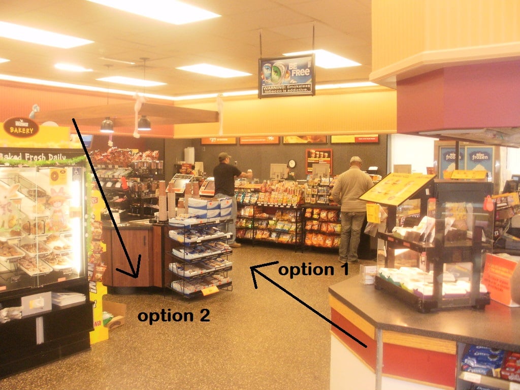 Of course, this will vary by location. My local Wawa is, unfortunately, the Aramingo Avenue one, which is a total shit show. Oftentimes you just stand wherever you can find room, since there’s typically 100 people in there at a time. But in a typical Wawa, I’d stand at either of these areas: