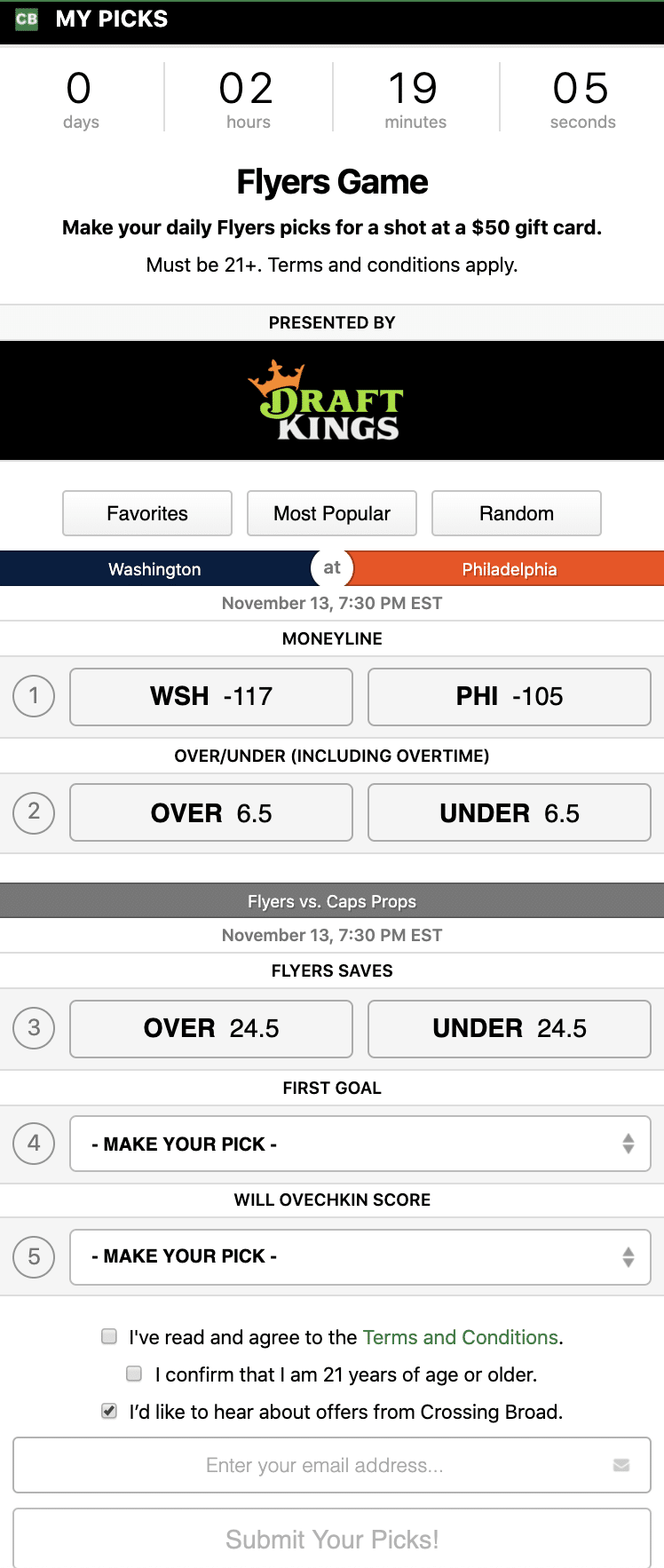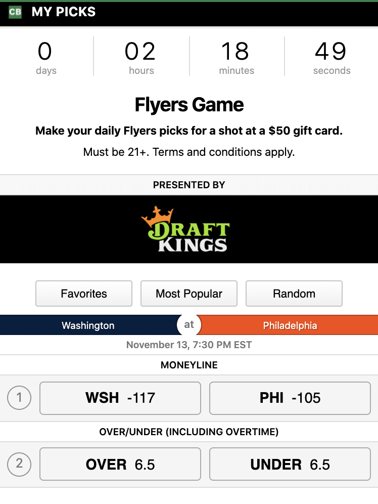 The Flyers host the Capitals tonight on national TV, and thanks to our friends at Chalkline, you can play our free Daily Flyers Game contest and win prizes including a $50 gift card to the Crossing Broad Store! All you have to do is CLICK HERE, enter your email, and pick the following: