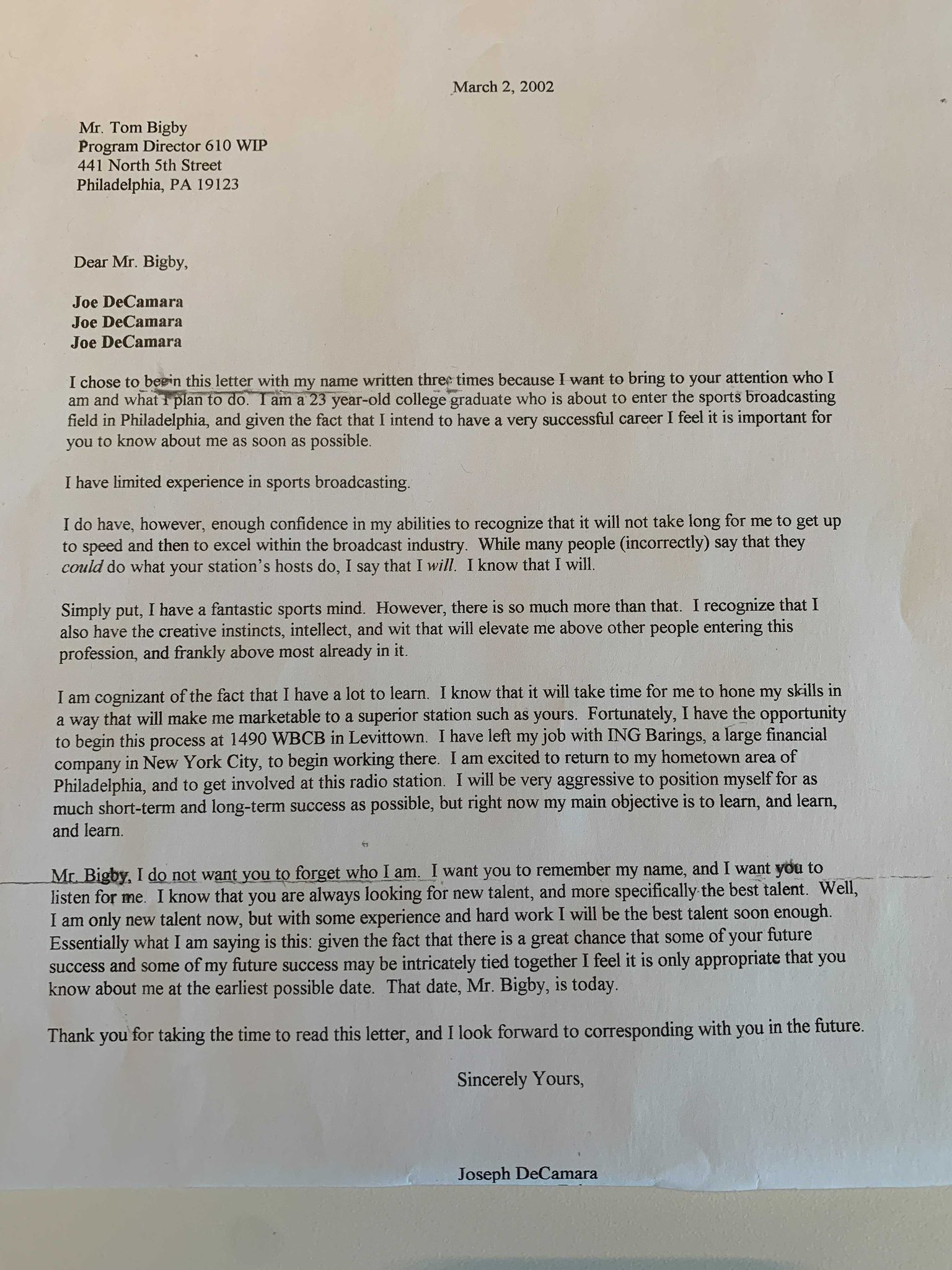 It all started though with a letter to then-PD Tom Bigby (RIP), who DeCamara contacted in 2002, declaring that he would one day be a radio stud. Aka he called his shot, and WIP shared the letter on Twitter: