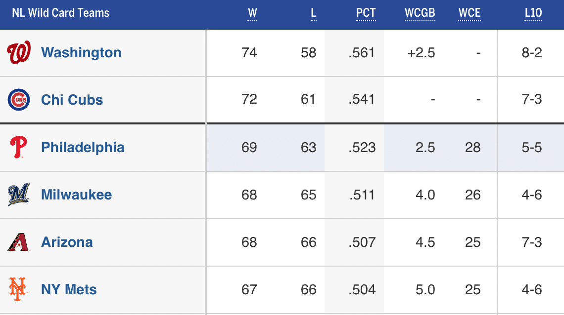 With the team off yesterday, the Phils are now 2.5 games behind the Cubs for the second wild card spot: