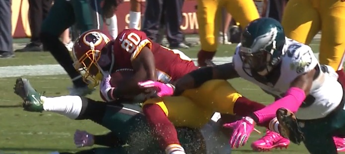 Hey remember that Avoid 95 At All Costs sign? Now, opposing teams not only don’t avoid it, but they also make it their exclusive expressway to first down town and touchdown city and other assorted bad puns. Here’s Mychal Kendricks making a “tackle”: