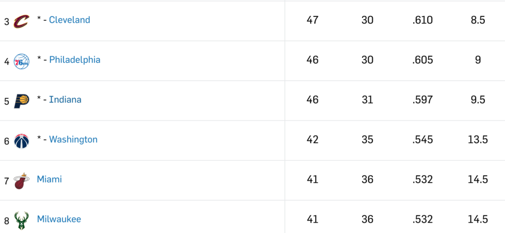 In the playoff race, Cleveland and Indiana both won yesterday, while Washington, who did get John Wall back on Friday, fell to the Bulls. Let’s take a look at the updated Eastern Conference standings: