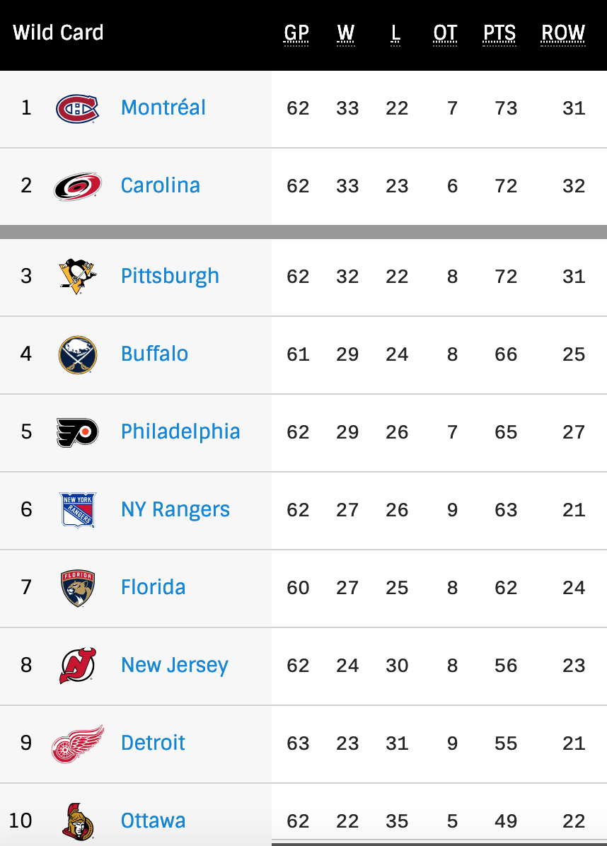 As for the current team, they have Buffalo on Tuesday night. Here’s how the standings look for the two wild card spots: