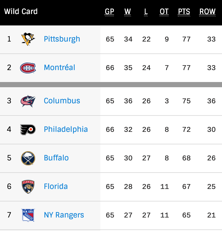 The team is back in action Wednesday night at home against the Capitals. Here’s what the wild card hunt looks like: