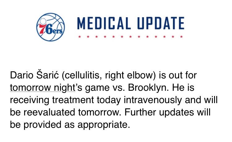 The Sixers look for their 11th straight win tonight as they host the Brooklyn Nets at 7 PM on NBC Sports Philadelphia. They will do so without Dario Saric for the second straight game, and possibly more.