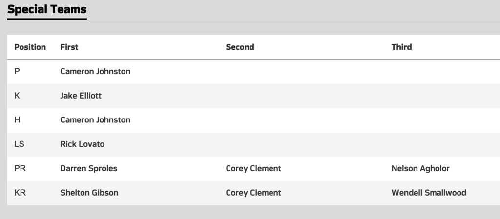 Brandon Graham: “If I had to pick one, [Corey] Cle-MENT, CLE-ment. I don’t want to say his name wrong [cackles]. He’s just shown me that he’s ready for year two, like he seems more confident than he was last year, even though he was confident then. But now he knows what to expect. I feel like there’s gonna be a lot of downhill running, a lot of big-yardage plays for him.”