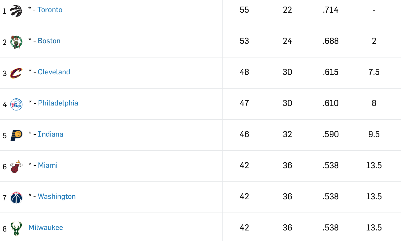 The Sixers also got some help in their push for the playoffs. Even though Cleveland defeated Toronto by six, Indiana lost to the Nuggets by three out west. Their next two games are Golden State and Toronto. Miami won and Washington lost, which means the Heat are now in sixth place. Here’s an updated look at the playoff standings: